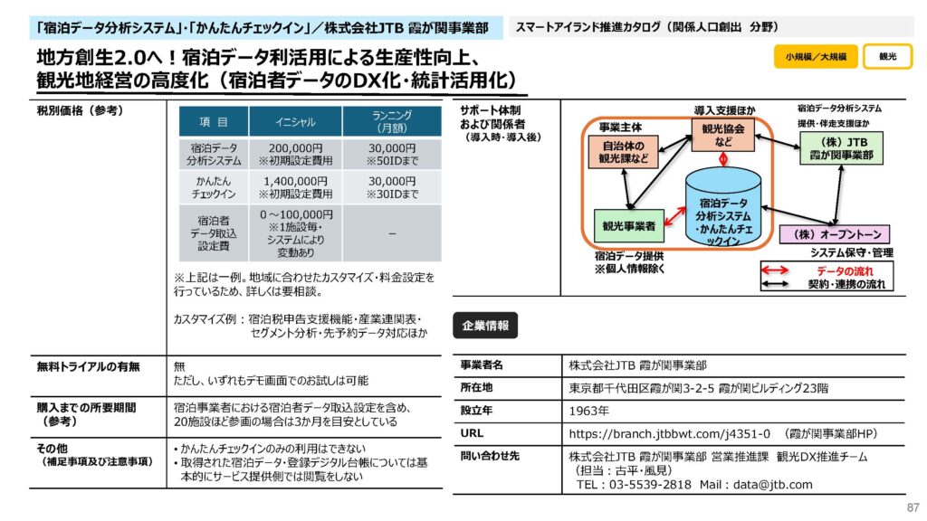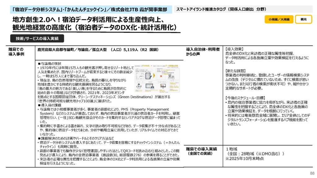 2026.01.21 地方創生2.0へ!宿泊データ利活用による生産性向上、観光地経営の高度化(宿泊者データのDX化・統計活用化) 資料をダウンロード 前の記事PREV 過去のスマートアイランド推進実証調査の事例 スマートアイランド推進カタログ